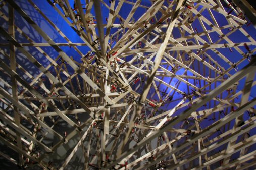 450 Stk. 2m lange Latten, 820 Stk. Schraubzwingen, Flaschenzug und 8 und 3mm starke Stahlseile, die fast unsichtbar die Konstruktion absichern.