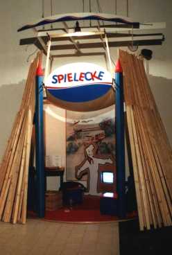 Spielecke aus dem ehem. Geschäft (mit Latten umstellt),