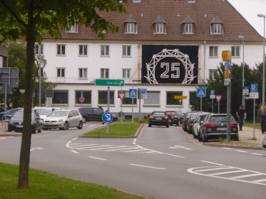 Material: Stahl, gestrichen in den Corporate Identity-Farben der Hochschule.