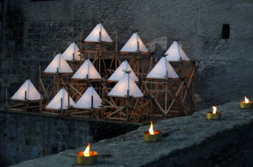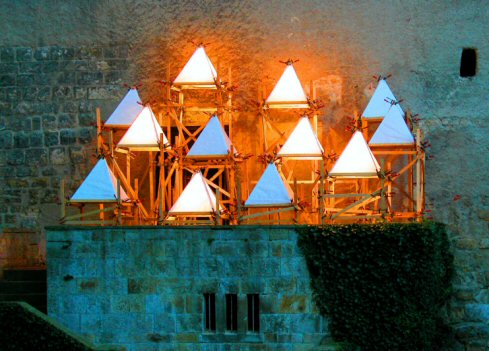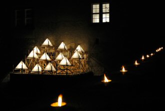 Das Ensemble assoziierte eine Burganlage bei Nacht, hinter deren dicken Mauern die Geheimnisse nach außen strahlen und den Rezipienten zu allerlei Fantasien anregten , wie auch dazumal das gemeine Volk: feine Feste mit edlen Gästen,