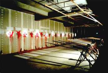 ![]() "Genickschuss-Zelle" 4m x 4m x 3,5m Latten, Zwingen, Podest, Projektionslampe, Lautsprecher-Boxen, Blitzlicht-Lampen, Steuergerät |