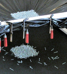 Gleich einer Sanduhr fließen Schrauben durch einen engen Trichter und sammeln sich auf dem Boden an, bis das Füllhorn leer und die Zeit vergangen ist.