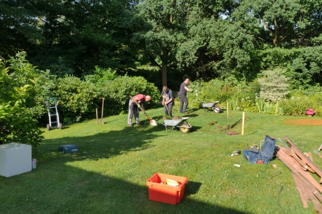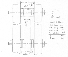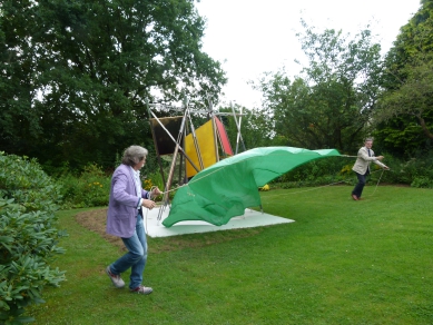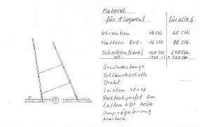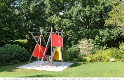 Dieses Werk wurde bereits in der Einzelausstellung im Gewölbekeller im Schloss Wolfsburg gezeigt. Da dieses Werk im Garten der Kunststiftung Bönsch aufgestellt werden sollte, wurden die Holzlatten hier aus Gründen der Verwitterung durch V2A-Rohre, die Zwingen durch V2A-Schrauben ersetzt. Eine 15cm dicke Betonplatte, in der die Rohre eingebettet sind, verhindert das Umkippen bei Sturm.