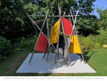 3 x 3 x 3 m, V2A-Rechteck-Rohre, Schrauben, Holzplatten in den Farben schwarz, rot, gelb auf Betonplatte.