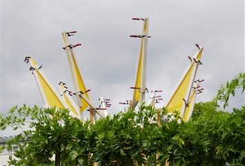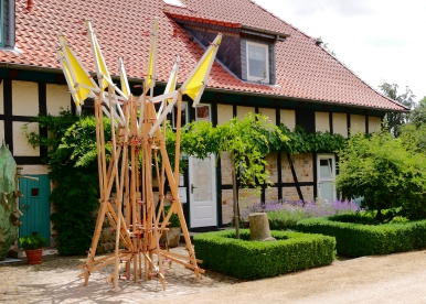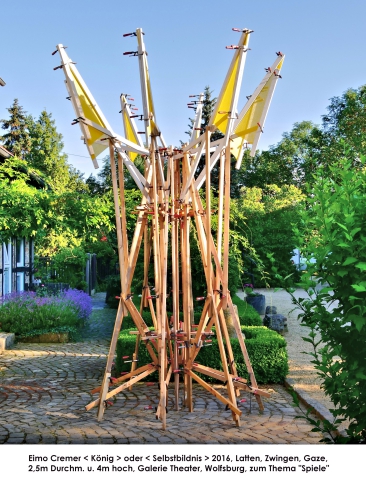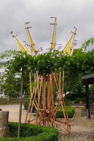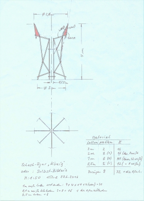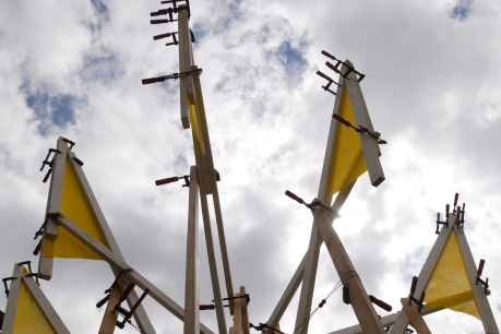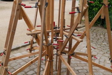 Maße: 2,5 m Durchmesser und 4 m hoch. Material: Latten, Zwingen, Gaze