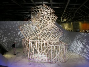 Die Montable " Kreisende Kuben " besteht aus 10 ineinander verschachtelten Kuben mit der Kantenlänge von 2m, wobei 2 bis 4 Seiten "vergattert" sind. Ein an der Decke angebrachter Motor bringt das Lattenwerk in Bewegung, ca. 0,3 - 0,6 Umdrehungen/min regelbar.