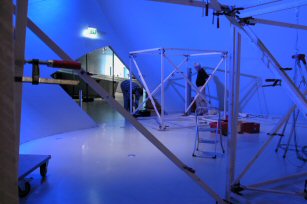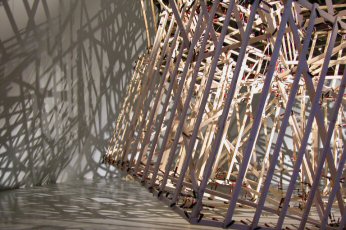 450 Stk. 2m lange Latten, 820 Stk. Schraubzwingen, Flaschenzug und 8 und 3mm starke Stahlseile, die fast unsichtbar die Konstruktion absichern.