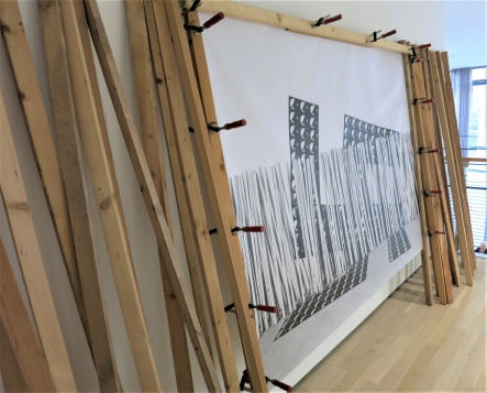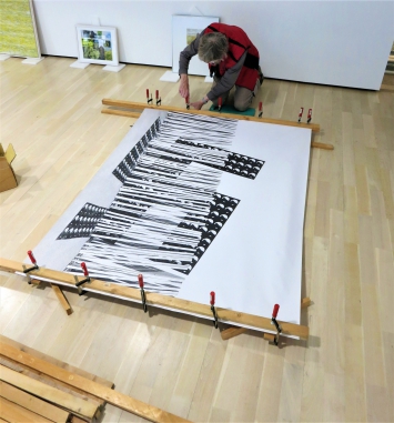 aus DIN A4 Papierblättern (mit dem Konterfei von Hitler in negativer Form), die an der Wand und auf dem Boden tapeziert waren. Es erstreckte sich auf den Boden 2 m in den Innenraum hinein. Der Besucher wurde damals aufgefordert, auf das Hakenkreuz zu trampeln und damit den Faschismus sinnbildlich in den Boden zu stampfen.