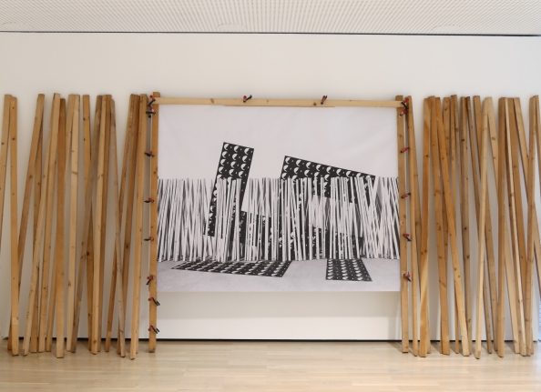 Die vor dem Hakenkreuz platzierten 2m-Latten symbolisieren die perfiden Methoden des Neonazismus.