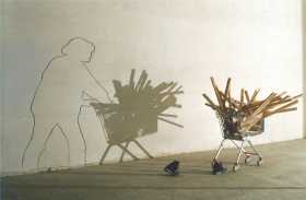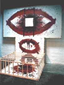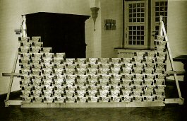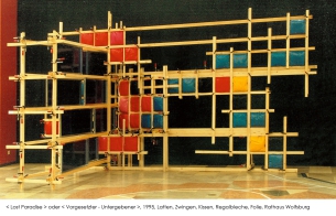 ![]() "Lost Paradise" oder "Vorgesetzter - Untergebener" Rathaus Wolfsburg 1995 5m x 3m x 3m Latten, Zwingen, Kissen, Regalbleche, Folie |