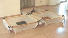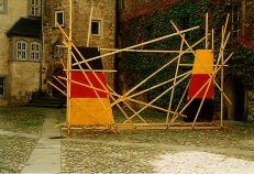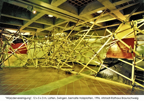 ![]() "Wi(e)dervereinigung" Opernplatz, Hannover 3. Oktober 1998 Latten, Zwingen, bemalte Holzplatten (Ein Bericht war in den ARD-Tagesthemen am 3. Okt. 1998) |