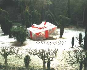 ![]() "Ho(h)ly Christmas" Kunststätte Bossard, 2001/2 6m x 4m x 4m Latten, Zwingen, Folie, Farbe, Stahlseile |