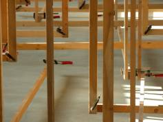 mit Zwingen gehalten, die jeweils an einem Faden über einer Fläche