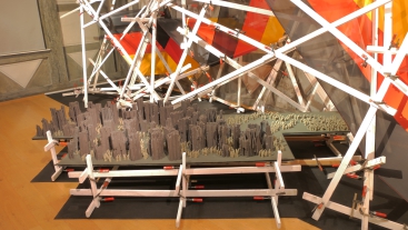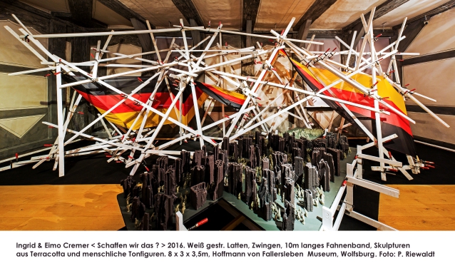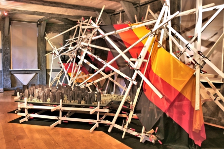 Das im Lattengestell eingespannte 10m lange Flaggenband zeigt wie in einer Fieberkurve das Auf und Ab in der deutschen Geschichte und zeigt Menschen, die aus bombardierten Städten unters deutsche Dach flüchten.