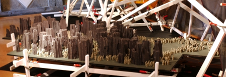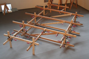 B x T x H 8 x 3,5 x 3 m, Material: weiß gestrichene Latten, Schraubzwingen,10m langes Flaggenband, viele Skulpturen aus Terracotta und hunderte menschliche Tonfiguren.