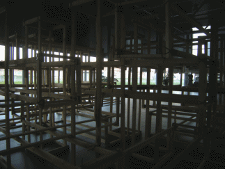 Zwischen diesen beiden Extremen ("Ruinenstadt" und "Neuer Stadt") zeigte ich auf Leinwand gedruckte Fotos früherer Arbeiten, Werke des Schreckens, der Hoffnungslosigkeit und Gewalt, die Menschen angetan worden sind.