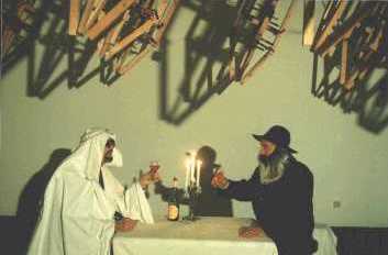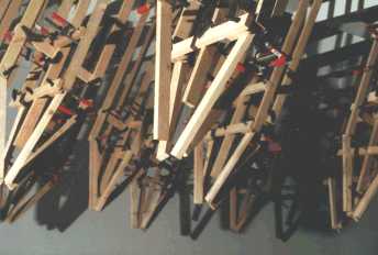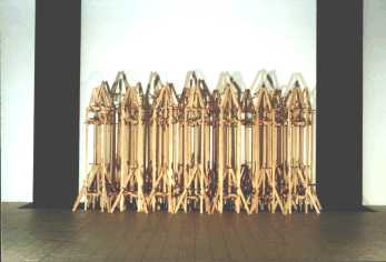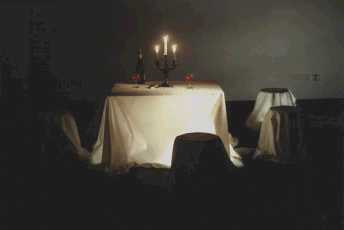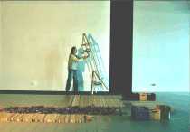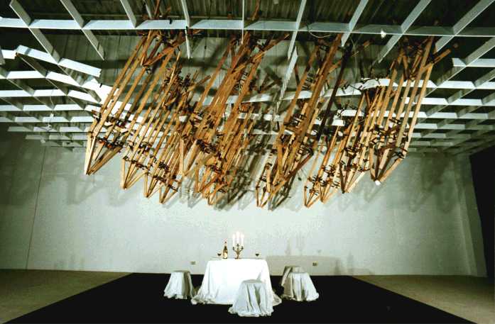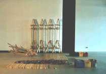 Latten, Schraubzwingen, Rasterdecke, Tisch, Hocker, Gläser, Rotwein, Kerzenständer, Fließpapier, schwarz gestr. Tapete.