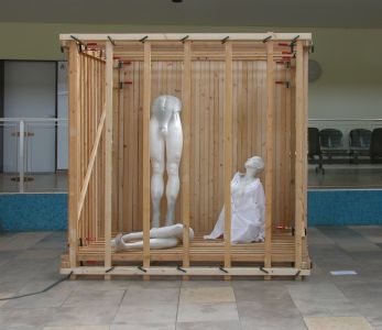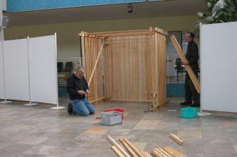 2m x 1,4m x 2m, Latten, Zwingen, Puppen.